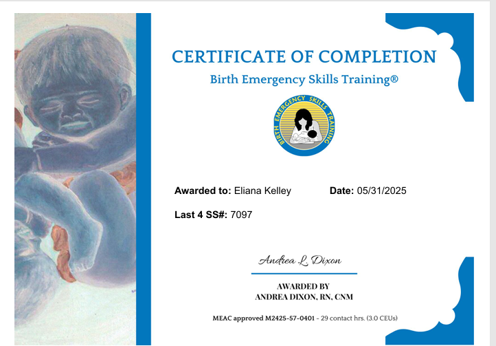 Birth emergency skill training certificate. I received this through a MEAC-approved course with 29+ contact hours. With this, I learned neonatal resuscitation, optimal labor and birth positions for a variety of scenarios, how to listen to fetal heart rate, and how to feel a baby’s position externally & internally.
