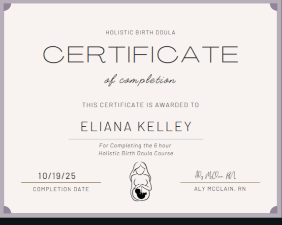 Doula certification. I received this from the 6-hour in-person class with Aly McClain. This includes comprehensive training in labor support, advocacy, and emotional care. I also received education on optimal labor and birth positions for a variety of scenarios.